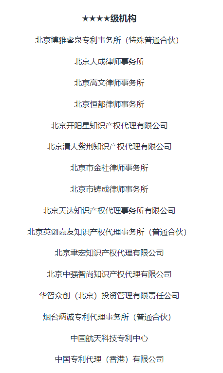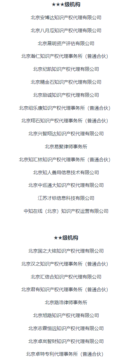 首都知識產(chǎn)權(quán)服務(wù)業(yè)協(xié)會本次等級評定工作遵循公開、公正、透明的原則,嚴(yán)格按照標(biāo)準(zhǔn)評分要求,根據(jù)機(jī)構(gòu)所提交材料信息及其完整度進(jìn)行評定。經(jīng)評審工作組初審、復(fù)審,專家書面評審及理事會審議,最終確定2023年度知識產(chǎn)權(quán)服務(wù)機(jī)構(gòu)等級評定結(jié)果,其中AAAAA級機(jī)構(gòu)19家,AAAA級機(jī)構(gòu)16家,AAA級機(jī)構(gòu)16家,AA級機(jī)構(gòu)9家。