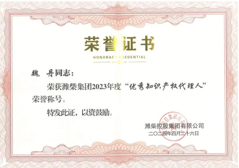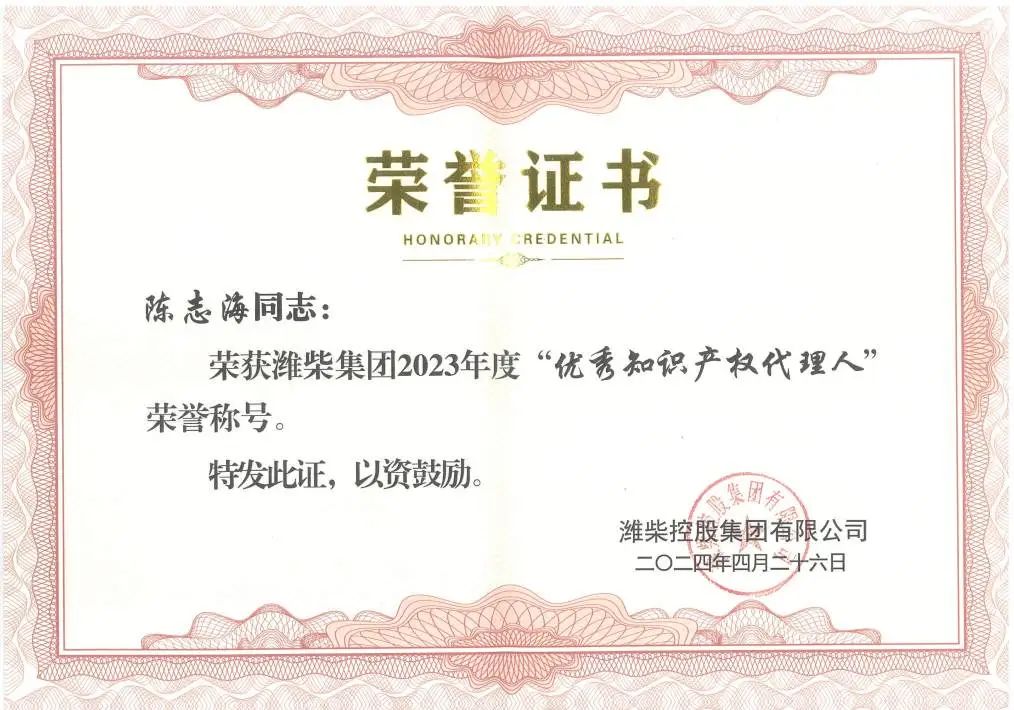 同時,濰柴集團授予集佳專利代理師陳志海、魏丹2023年度“優(yōu)秀知識產(chǎn)權代理人”榮譽稱號,對他們精湛的業(yè)務能力與認真負責的專業(yè)態(tài)度點贊!
