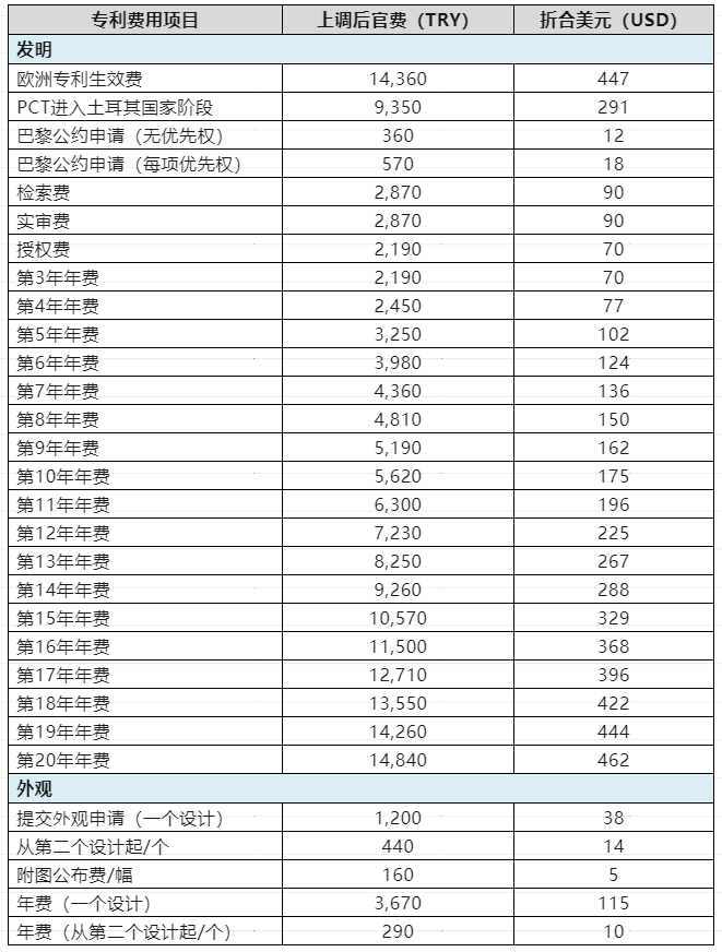 2024年4月24日,土耳其專利局公布了新的官費(fèi)標(biāo)準(zhǔn),本次調(diào)整是繼2024年1月后今年的第二次官費(fèi)調(diào)整,調(diào)整后官費(fèi)標(biāo)準(zhǔn)如下: