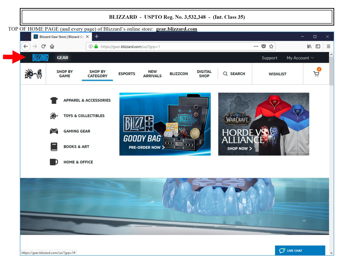 ”設(shè)計(jì)商標(biāo)注冊(cè),保護(hù)范圍覆蓋多個(gè)類別,包括第35類“電子商務(wù)服務(wù),即提供在線零售商店和郵購服務(wù),均以服裝、書籍、鼠標(biāo)墊、玩具、游戲?yàn)樘厣?。Blizzard曾對(duì)各種包含“Blizzard”或相關(guān)詞匯的商標(biāo)申請(qǐng)和域名發(fā)起維權(quán)行動(dòng)。
