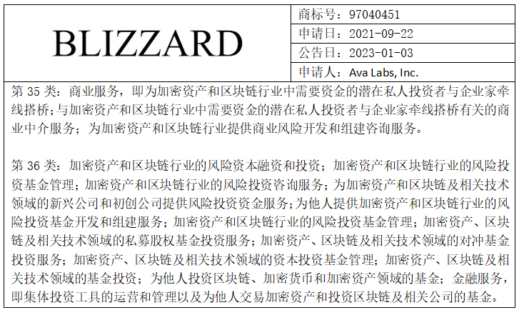 此次異議爭(zhēng)議源于Ava Labs向美國專利商標(biāo)局申請(qǐng)注冊(cè)“BLIZZARD”商標(biāo),申請(qǐng)覆蓋與區(qū)塊鏈相關(guān)的第35類商業(yè)服務(wù)和第36類金融服務(wù)。經(jīng)初步審定,商標(biāo)公告信息如下: