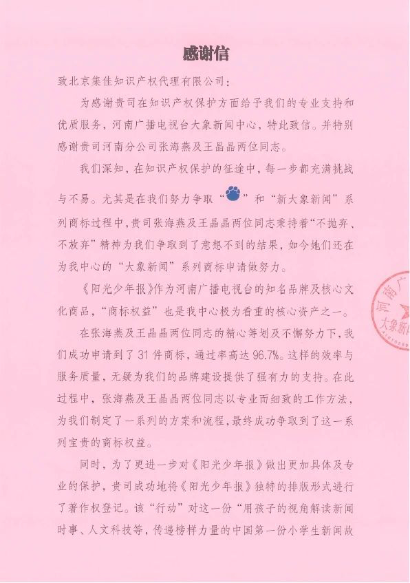 感謝信中提到,集佳工作人員在為客戶爭取“陽光少年報”系列商標過程中精心籌劃、不懈努力,取得了意想不到的成果,成功申請到31件商標,通過率高達96.7%。同時,《陽光少年報》作為河南廣播電視臺的知名品牌及核心文化商品,為了更進一步對其開展具體及專業(yè)的保護,集佳成功將《陽光少年報》獨特的排版形式進行了著作權(quán)登記,對這份“用孩子的視角解讀新聞時事、人文科技等,傳遞榜樣力量的中國第一份小學生新聞故事報”從多角度進行了有效的法律保護,進一步鞏固了該份報紙的市場地位。這些努力在一定程度上為未來“大象新聞”品牌的發(fā)展奠定了更加堅實的基礎,也為客戶未來的商標戰(zhàn)略鋪平道路。對此,客戶對集佳表達誠摯感謝與加深合作的美好期望!