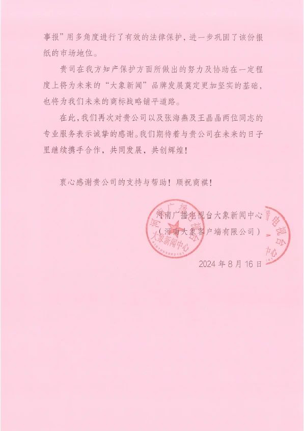 近日,我們收到河南廣播電視臺大象新聞中心(河南大象客戶端有限公司)的感謝信,對集佳在知識產(chǎn)權(quán)方面給予的專業(yè)支持與優(yōu)質(zhì)服務表示衷心感謝,并熱情稱贊集佳河南分公司張海燕與王晶晶在服務中展現(xiàn)出的“不拋棄、不放棄”的鉆研精神與專業(yè)細致的工作態(tài)度!