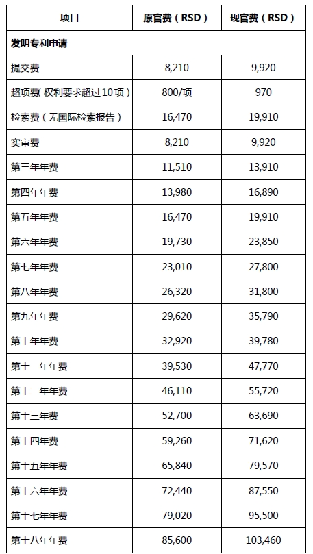 2024年8月1日起,塞爾維亞上調(diào)與知識產(chǎn)權(quán)相關(guān)的官費(fèi),上調(diào)幅度約為5%,與發(fā)明和實用新型專利申請相關(guān)的官費(fèi)如下: