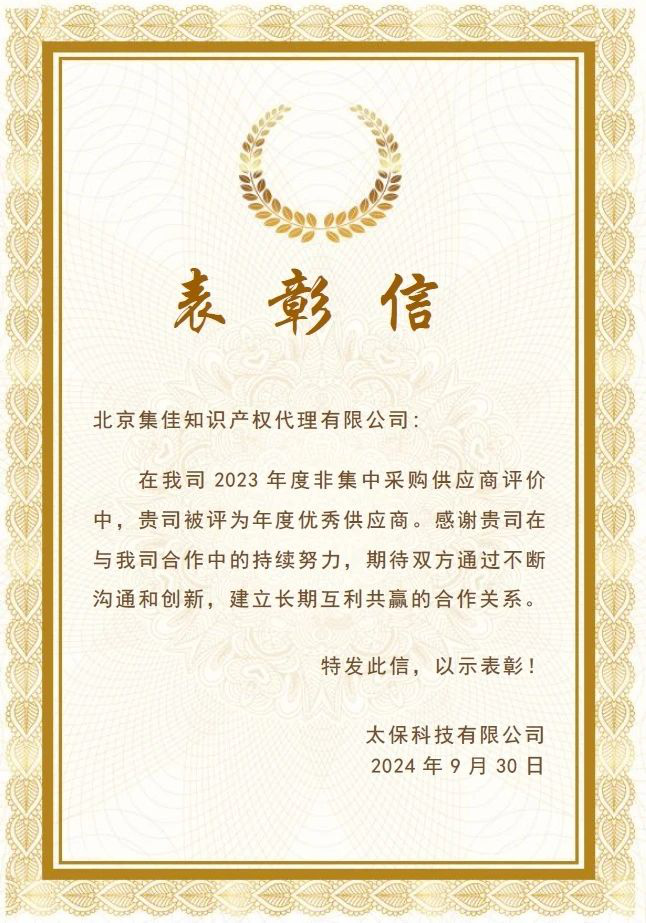 近日,集佳喜獲客戶(hù)太??萍加邢薰镜谋碚眯?,授予集佳“年度優(yōu)秀供應(yīng)商”榮譽(yù)稱(chēng)號(hào),感謝集佳在與太??萍己献髦械某掷m(xù)努力,并期待雙方通過(guò)不斷溝通和創(chuàng)新,建立長(zhǎng)期互利共贏的合作關(guān)系。