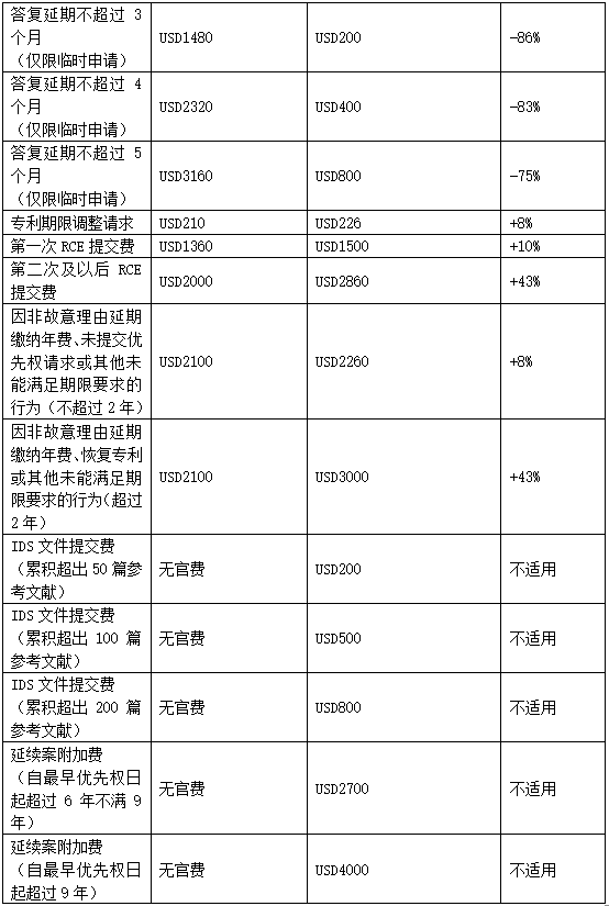 ?初始提案中上調(diào)幅度約5%的官費(fèi)項(xiàng)目,本次普遍進(jìn)一步上調(diào)至約8%,如臨時(shí)申請(qǐng)費(fèi)、超頁費(fèi)、多項(xiàng)引用附加費(fèi)、答復(fù)延期費(fèi)(非臨時(shí)申請(qǐng))、發(fā)明授權(quán)費(fèi)、年費(fèi)等;