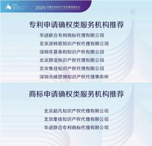 近日,由中國(guó)企業(yè)知識(shí)產(chǎn)權(quán)發(fā)展沙龍主辦的“2024中國(guó)企業(yè)知識(shí)產(chǎn)權(quán)發(fā)展高峰論壇”在深圳隆重舉行,論壇上發(fā)布了中國(guó)企業(yè)知識(shí)產(chǎn)權(quán)發(fā)展沙龍知識(shí)產(chǎn)權(quán)服務(wù)機(jī)構(gòu)推薦名單,集佳知識(shí)產(chǎn)權(quán)憑借出色的專業(yè)實(shí)力和良好的客戶口碑,榮登“專利申請(qǐng)確權(quán)類服務(wù)機(jī)構(gòu)”“商標(biāo)申請(qǐng)確權(quán)類服務(wù)機(jī)構(gòu)”榜單!