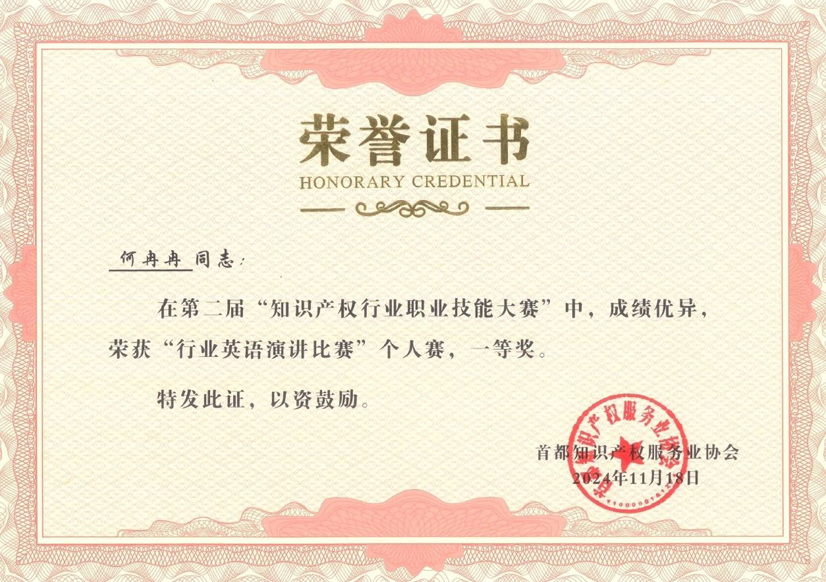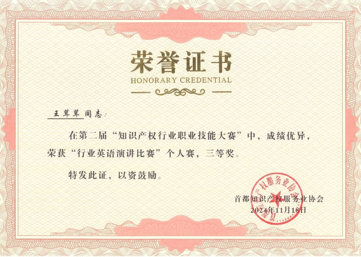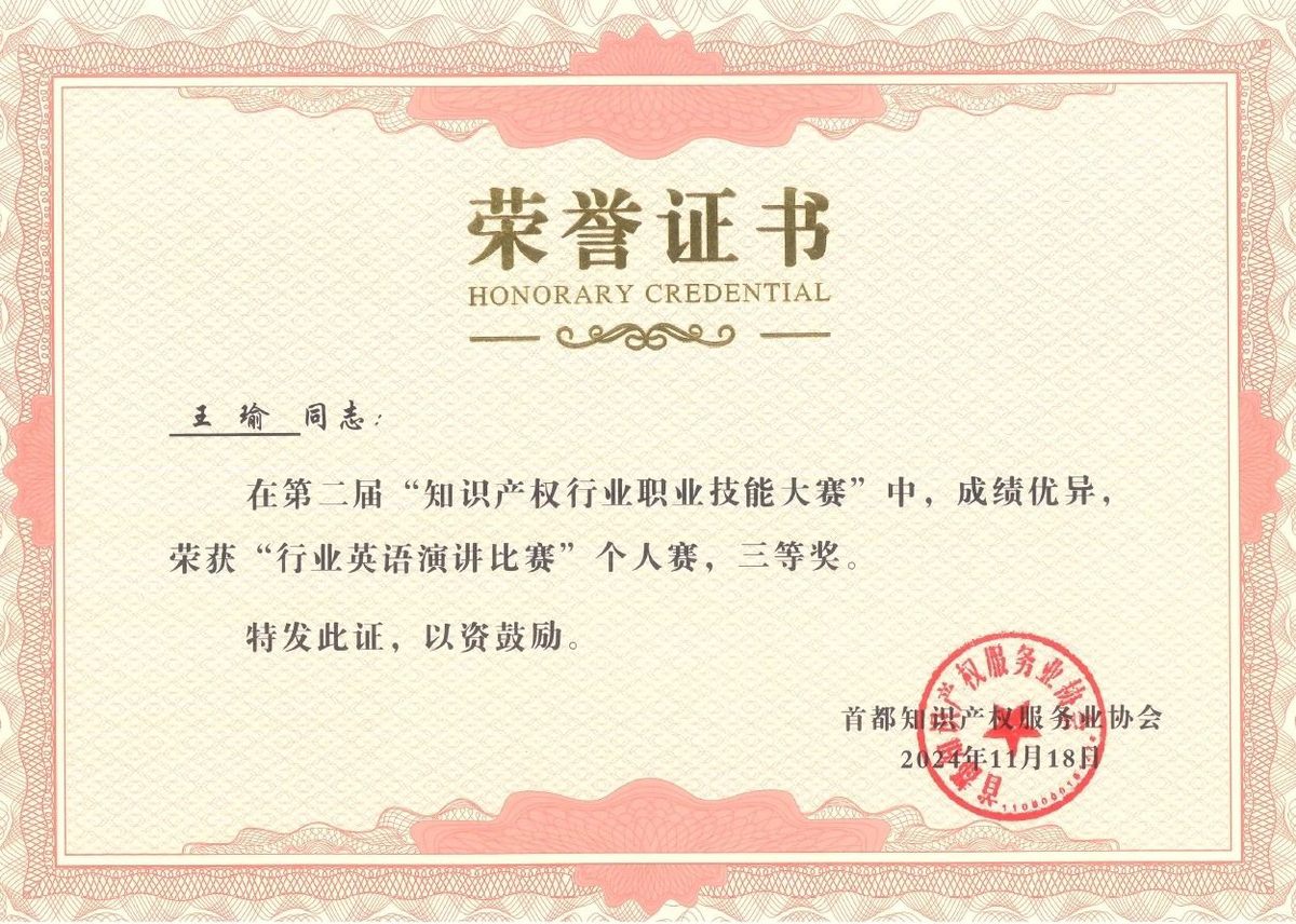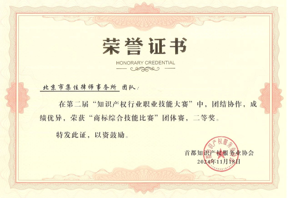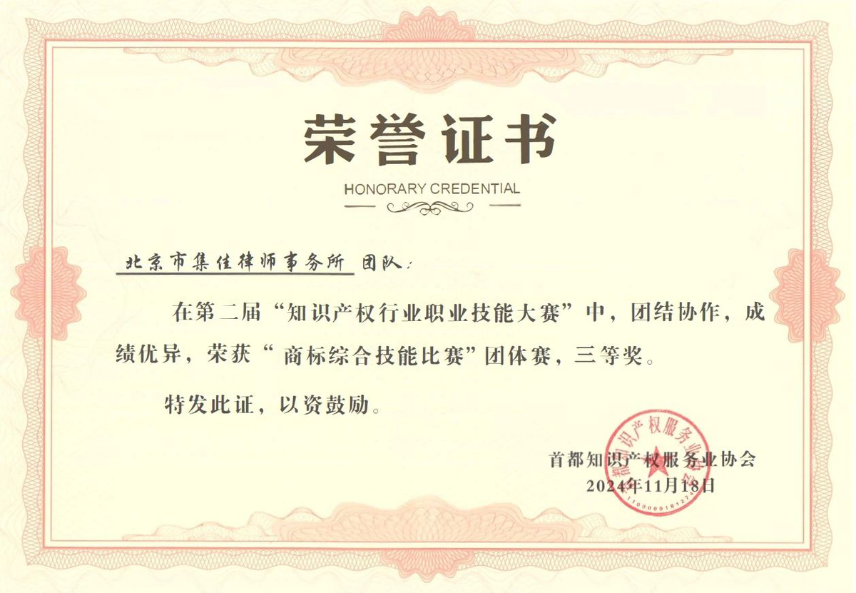近日,在北京市知識產權局、海淀區(qū)市場監(jiān)督管理局(區(qū)知識產權局)的指導下,由首都知識產權服務業(yè)協會主辦,中國知識產權研究會專利專業(yè)委員會、北京(中關村)國際知識產權服務大廳承辦的第二屆“知識產權行業(yè)職業(yè)技能大賽”圓滿落幕,集佳多位代理人與商標參賽團隊在本屆大賽中斬獲多項佳績。在“行業(yè)英語演講比賽”個人賽中,何冉冉力戰(zhàn)群雄,拔得頭籌榮獲一等獎,王茸茸、王瑜榮獲三等獎;在商標綜合技能比賽中,集佳參賽的兩支隊伍均取得優(yōu)異成績,由黎琳、趙敏敏、張雅靜三位組成的隊伍獲得二等獎,由李晴、伍君、曾珍三位組成的隊伍獲得三等獎。