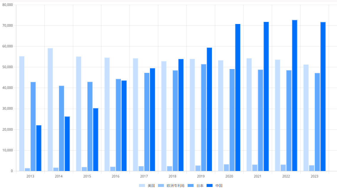 圖1 中美日歐PCT國(guó)際階段受理趨勢(shì)(2013-2023)