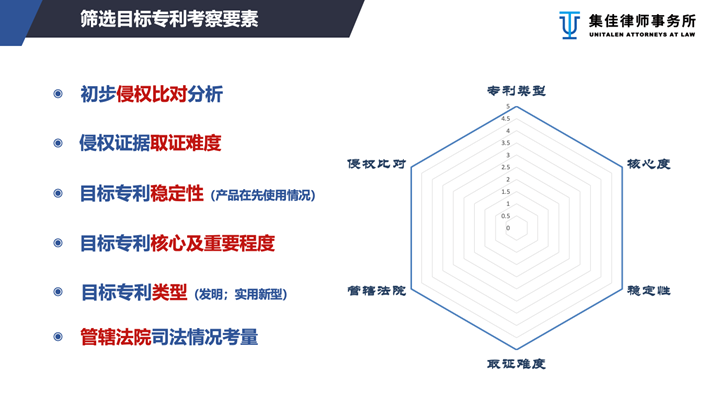 科技創(chuàng)新是發(fā)展新質(zhì)生產(chǎn)力的核心要素。知識產(chǎn)權(quán)司法保護能夠服務技術(shù)創(chuàng)新,為原始創(chuàng)新提供充分保護和有效激勵,推動形成高科技的生產(chǎn)力。而在當前司法實踐中因?qū)@謾?quán)訴訟的特殊性,主訴方通常需要在訴前基于多方因素考量綜合判斷選取合適的專利權(quán)作為訴訟的權(quán)利基礎(chǔ)。本文從侵權(quán)分析、取證難度、專利穩(wěn)定性、技術(shù)核心重要程度、專利類型、管轄法院這六大因素為切入點進行探討,而實踐中的案情紛繁復雜,千變?nèi)f化,限于作者水平所涉考量因素本文難以全面列舉,特以此文拋磚引玉,以供創(chuàng)新主體參考交流。