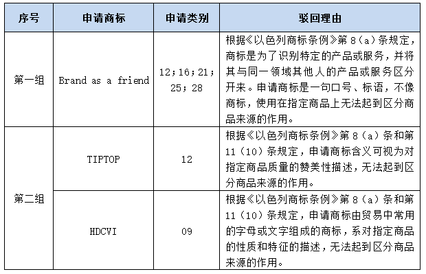 第一,爭辯申請商標(biāo)具有固有顯著性。以色列商標(biāo)申請?jiān)庥鋈憋@駁回后,一來反駁審查員的觀點(diǎn),爭辯申請商標(biāo)在整體含義等方面具有顯著性;二來可以列舉以色列當(dāng)國包含相同詞匯的商標(biāo)在相同類別上獲準(zhǔn)注冊的情形以及申請商標(biāo)在其他國家獲準(zhǔn)注冊的情形,以佐證己方申請商標(biāo)具有顯著性的觀點(diǎn)。