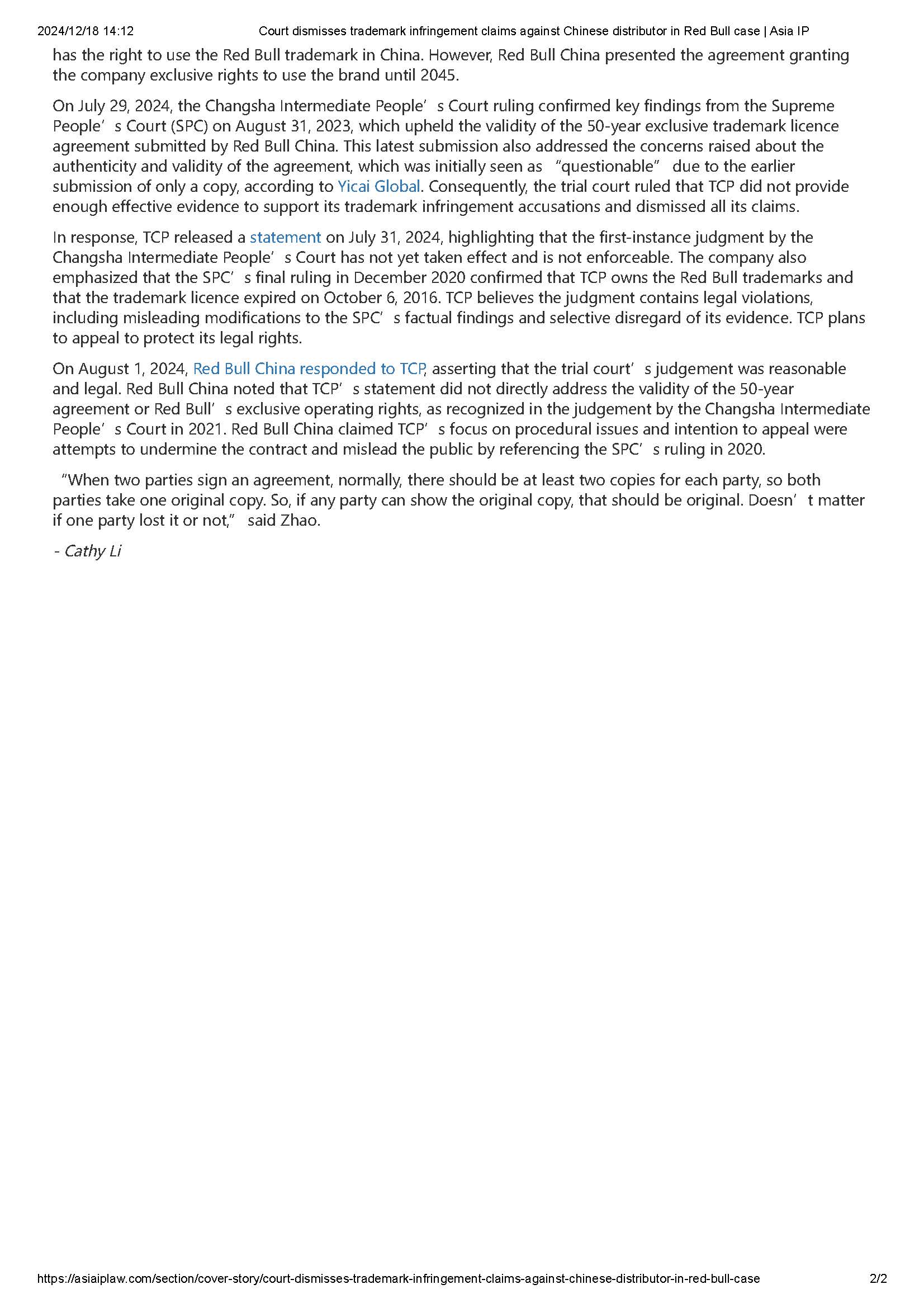 集佳合伙人趙雷Asia IP雜志評(píng)論:《Court dismisses trademark infringement claims against Chinese distributor in Red Bull case》