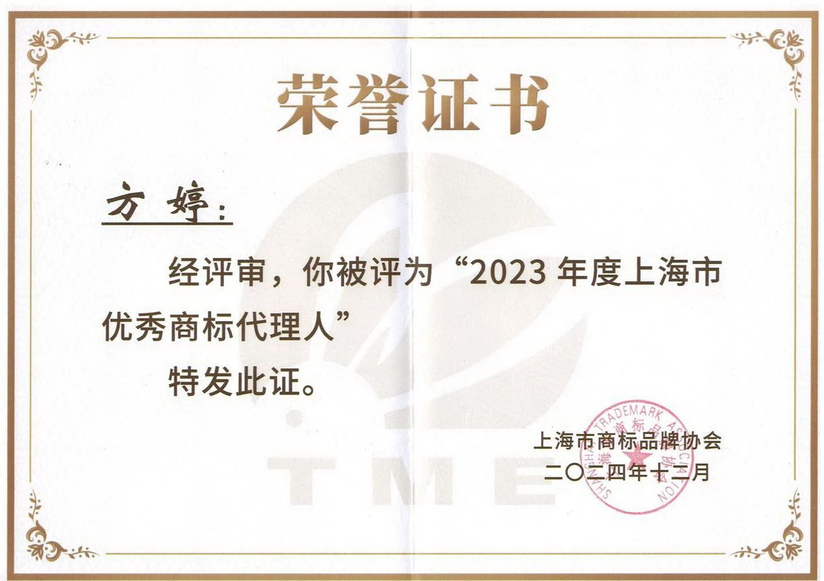 2025年1月7日,上海市商標(biāo)品牌協(xié)會(huì)召開(kāi)第六屆會(huì)員代表大會(huì),會(huì)上表彰了被評(píng)為2023年度“上海市優(yōu)秀商標(biāo)代理機(jī)構(gòu)”“優(yōu)秀商標(biāo)代理人”以及“上海市優(yōu)秀商標(biāo)代理機(jī)構(gòu)提名”的單位和個(gè)人。