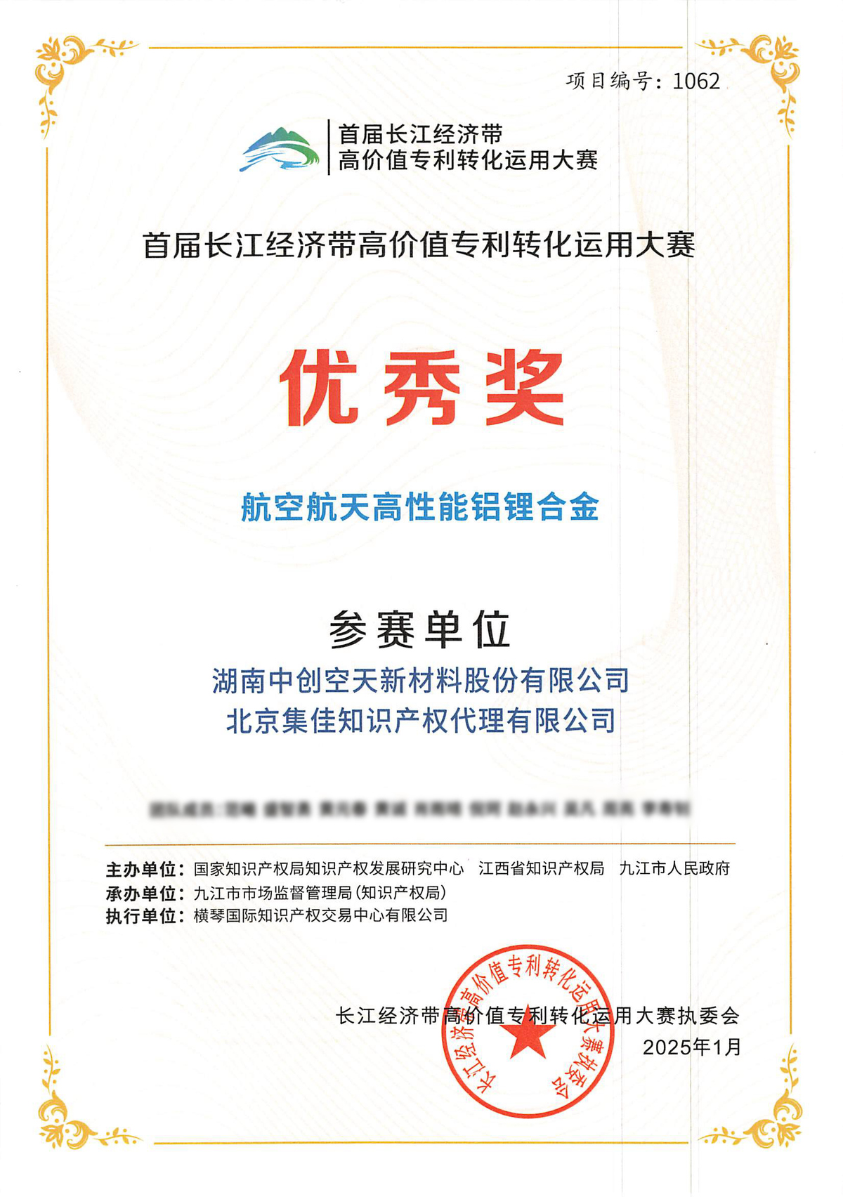 近日,在備受矚目的長江經(jīng)濟(jì)帶高價值專利轉(zhuǎn)化運(yùn)用大賽全國決賽中,由北京集佳知識產(chǎn)權(quán)代理有限公司與湖南中創(chuàng)空天新材料股份有限公司聯(lián)合參賽的“航空航天高性能鋁鋰合金”項(xiàng)目脫穎而出,榮獲優(yōu)秀獎。這一殊榮不僅是對項(xiàng)目團(tuán)隊(duì)卓越創(chuàng)新能力和不懈努力的高度認(rèn)可,也是雙方深度合作、共同推動科技成果高效轉(zhuǎn)化的生動見證。