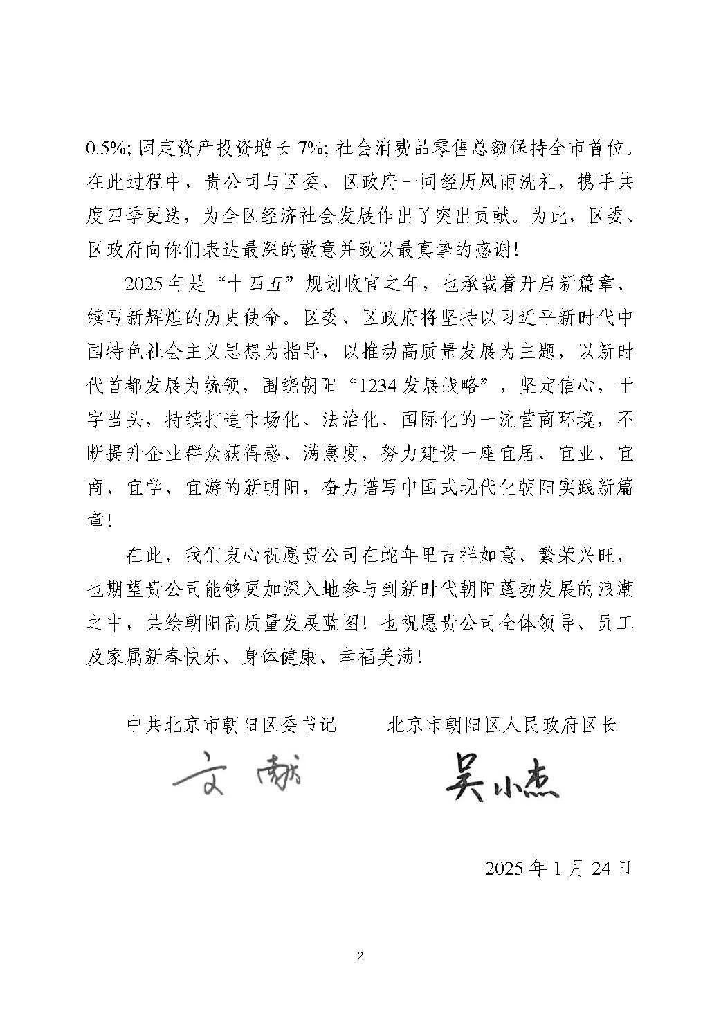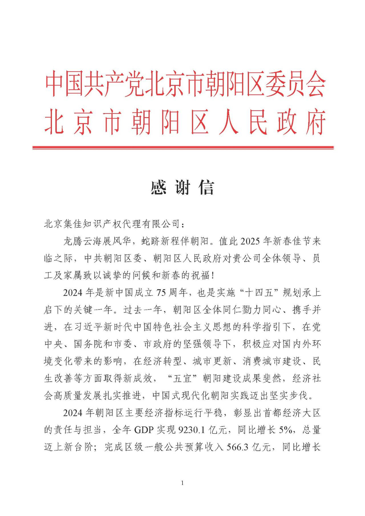 新春佳節(jié)來臨之際,集佳收到北京市朝陽(yáng)區(qū)委、區(qū)政府發(fā)來的感謝信。信中,區(qū)委、區(qū)政府肯定和感謝了集佳過去一年為朝陽(yáng)區(qū)經(jīng)濟(jì)社會(huì)發(fā)展作出的貢獻(xiàn),并對(duì)集佳全體領(lǐng)導(dǎo)、員工及家屬致以誠(chéng)摯的問候和新春的祝福!