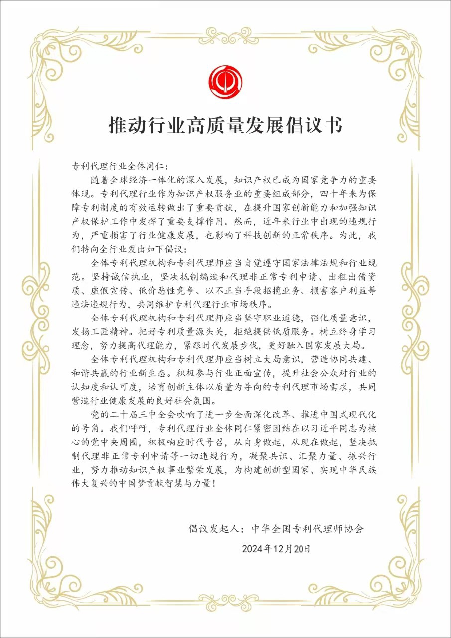 為進(jìn)一步規(guī)范專利代理市場(chǎng)秩序,提升專利代理服務(wù)質(zhì)量,促進(jìn)專利代理行業(yè)高質(zhì)量發(fā)展,中華全國(guó)專利代理師協(xié)會(huì)近期聯(lián)合各地方行業(yè)組織發(fā)布《推動(dòng)行業(yè)高質(zhì)量發(fā)展倡議書》。