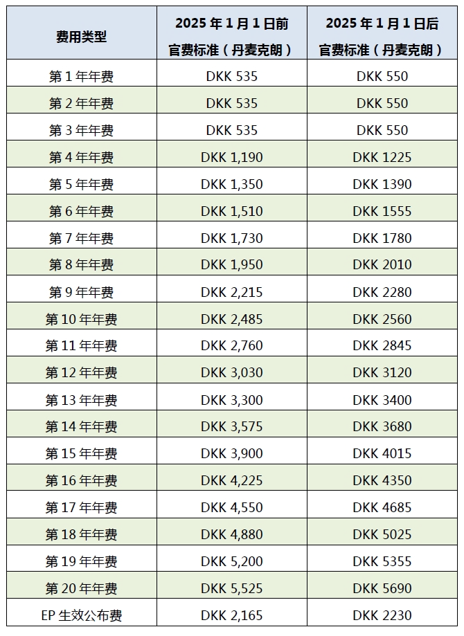 2025年1月7日,丹麥專(zhuān)利商標(biāo)局在其官網(wǎng)上公布,對(duì)包括已生效的歐洲專(zhuān)利在內(nèi)的專(zhuān)利公布和續(xù)展費(fèi)用進(jìn)行價(jià)格調(diào)整,費(fèi)用上漲了約3.0%。此次調(diào)整自2025年1月1日起生效。