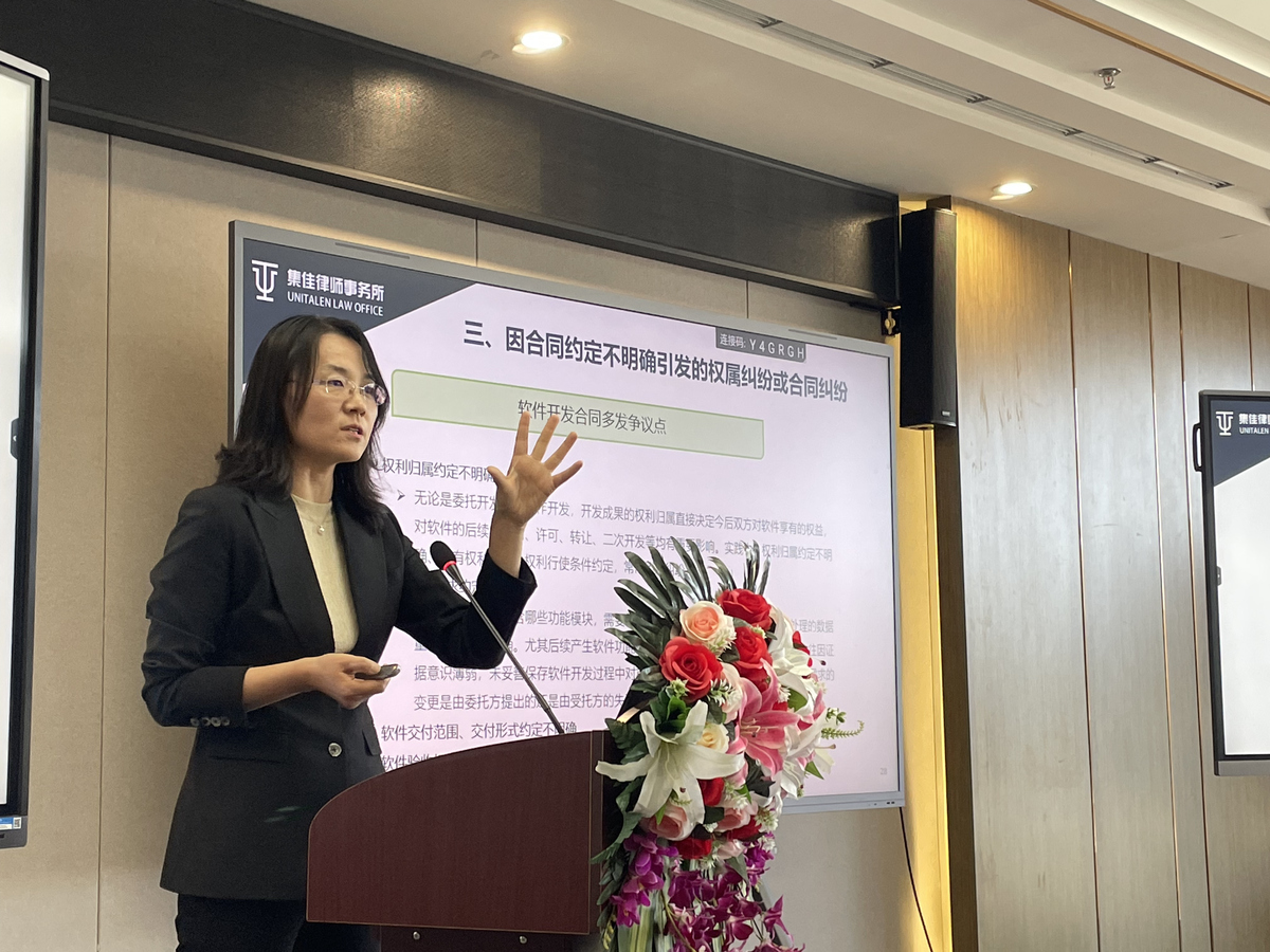 周丹丹律師在簡要介紹軟件著作權(quán)的保護范圍及保護期限、軟件著作權(quán)人享有的基本權(quán)利、常見的軟件著作權(quán)侵權(quán)行為等相關(guān)法律知識的基礎(chǔ)上,結(jié)合多個典型案例,對“員工離職引發(fā)軟件代碼抄襲糾紛”、“盜版軟件/超范圍使用商業(yè)軟件的侵權(quán)糾紛”、“因合同約定不明確引發(fā)的權(quán)屬糾紛或合同糾紛”等常見的軟件著作權(quán)糾紛類型進行詳細解讀,深入分析各類糾紛中反映出的企業(yè)常見問題,進而從軟件著作權(quán)的登記、軟件使用證據(jù)沉淀、軟件開發(fā)合同/合作開發(fā)合同核心條款的擬定、軟件采購、軟件投訴應(yīng)對、軟件源代碼管理等多個角度總結(jié)提煉出軟件著作權(quán)保護及風(fēng)險防控的實務(wù)要點,為與會企業(yè)提供了專業(yè)指引,內(nèi)容豐富詳實,實用性極強。