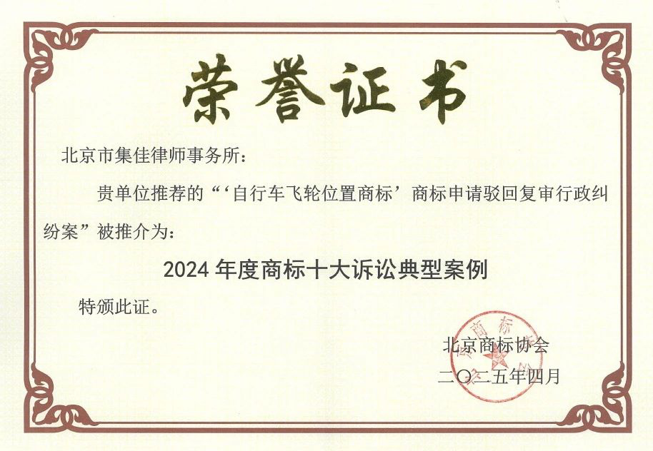 4月27日,北京商標協(xié)會發(fā)布2024年度北京商標十大訴訟典型案例,其中,集佳代理的斯拉姆有限責任公司(SRAM,LLC)訴國家知識產權局關于第G1729330號“自行車飛輪位置商標”商標申請駁回復審行政糾紛一案成功入選。